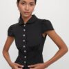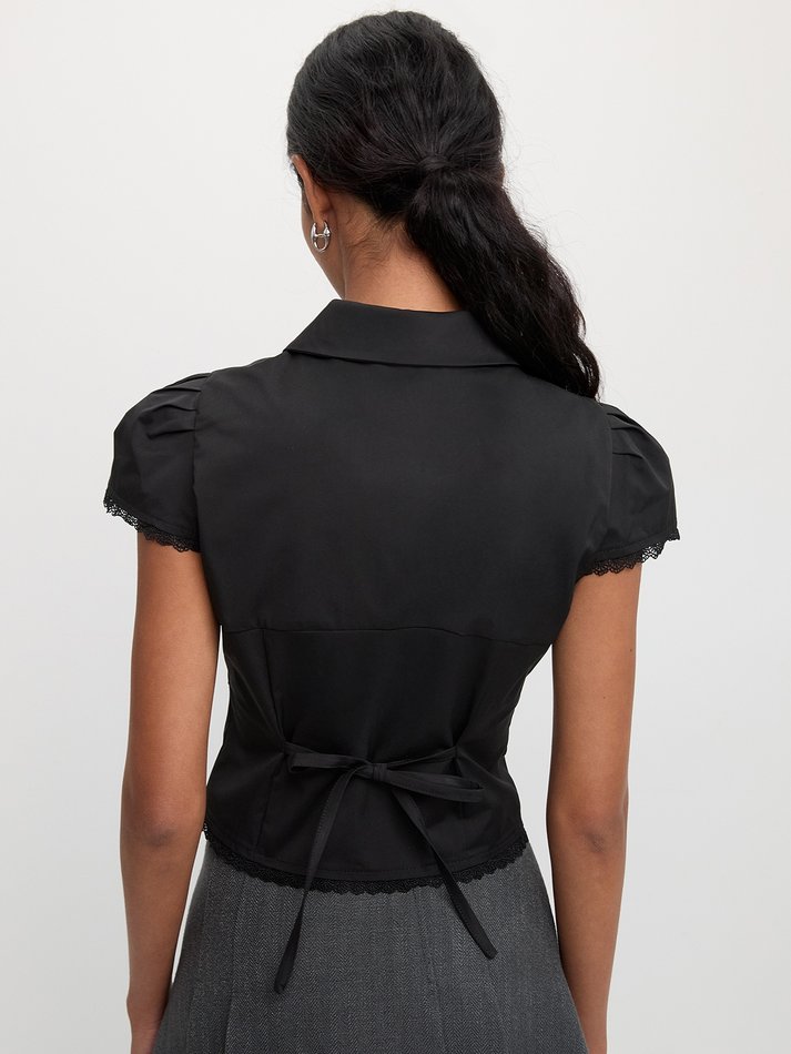 Bring a bold, polished touch to your formal and semi-formal outfits with this black fitted blouse. Featuring short puff sleeves and delicate lace-trim accents at the cuffs and hem, this blouse exudes understated elegance. The structured button-down front, feminine collar, and adjustable waist tie at the back create a tailored, flattering fit. Crafted in a smooth fabric, the blouse offers both comfort and style for office settings, meetings, or evening occasions.