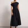 Step into contemporary elegance with this black midi dress, designed with a striking one-shoulder neckline and a fitted bodice that flows into a gathered, voluminous skirt. The asymmetric neckline provides a modern silhouette, while the cinched waist and full skirt offer graceful movement, perfect for formal evenings or party occasions. Crafted from smooth, structured fabric, this dress pairs effortlessly with statement accessories and metallic heels for a polished, fashion-forward look.