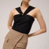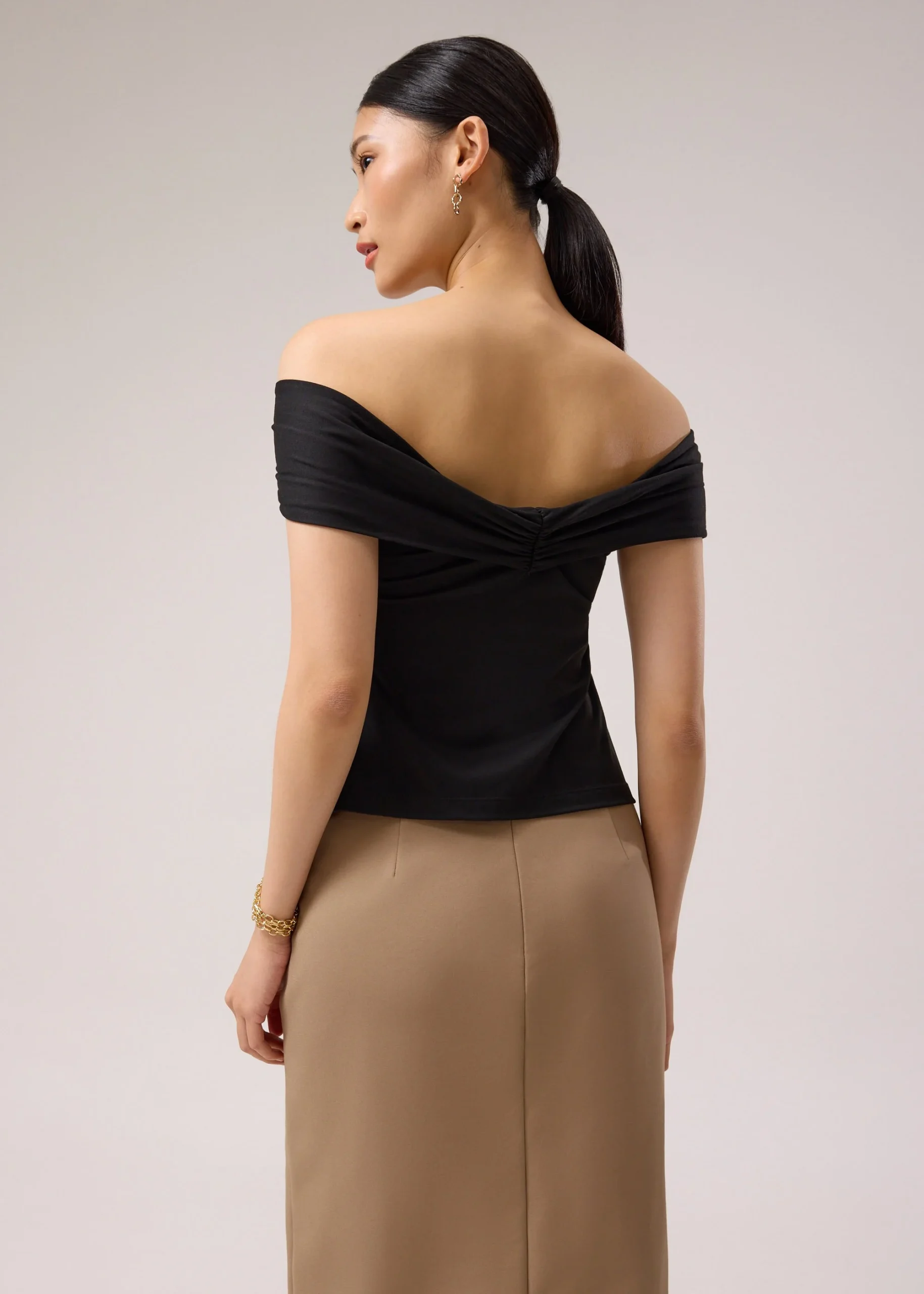 Exude evening elegance with this black strapless top, designed with a dramatic twisted neckline that gathers beautifully at the center front. Crafted from smooth stretch fabric, this piece features an open shoulder and upper chest, highlighted by a sleek metallic accent at the twist for subtle shine. The back drapes gracefully off the shoulders, offering both comfort and contemporary appeal. Ideal for dinner dates, special occasions, or standout moments, this top pairs beautifully with tailored skirts, trousers, or statement jewelry.