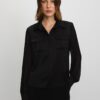 Enhance your professional wardrobe with this sophisticated black formal shirt, designed with utility-inspired chest pockets and a relaxed tailored fit. The shirt features an elegant pointed collar, front button closure, and airy sheer long sleeves for a contemporary look. Its classic styling is seamlessly complemented by structured cuffs and a soft, lightweight feel, making it a versatile choice for both office hours and evening occasions.