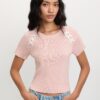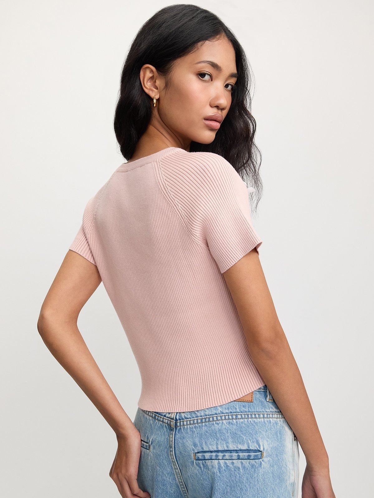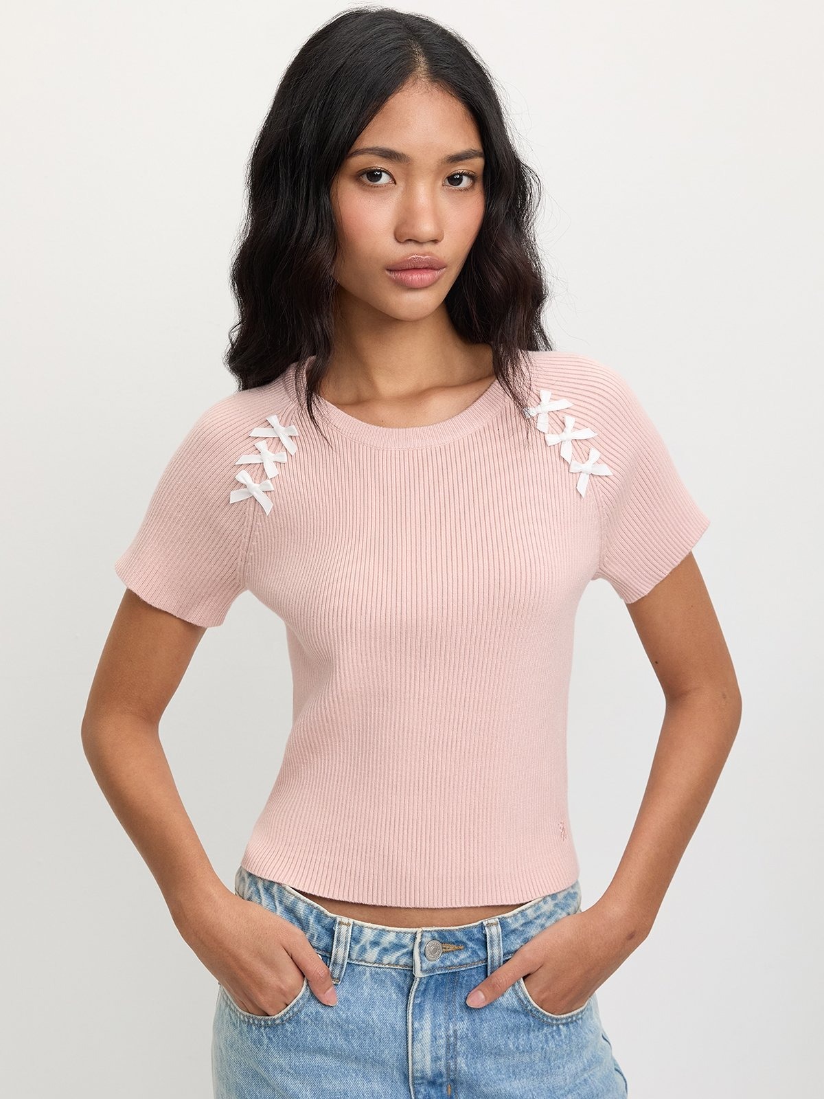 Refresh your everyday wardrobe with this elegant blush pink knit top, designed for a flattering slim fit and a modern cropped length. Crafted from a ribbed stretch fabric, this top features charming white bow accents on the shoulders, adding a playful yet refined touch. The short sleeves and round neckline make it a versatile pick for layered looks or solo wear in warmer months.