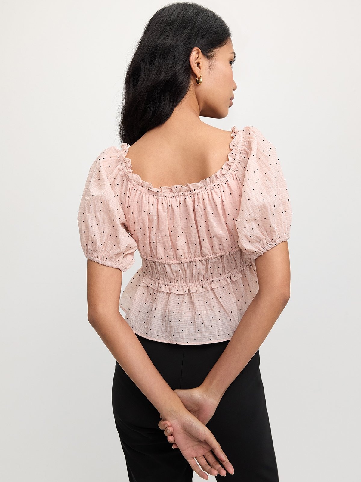 Add romance and charm to your wardrobe with this blush pink peplum top, sprinkled with dainty black dots for an elegant touch. The design features a flattering scoop neckline with ruffled edges, softly gathered puff sleeves, and a structured waist with tiered peplum detailing. Effortlessly feminine and perfect for making a statement, whether paired with smart trousers or a matching skirt.
