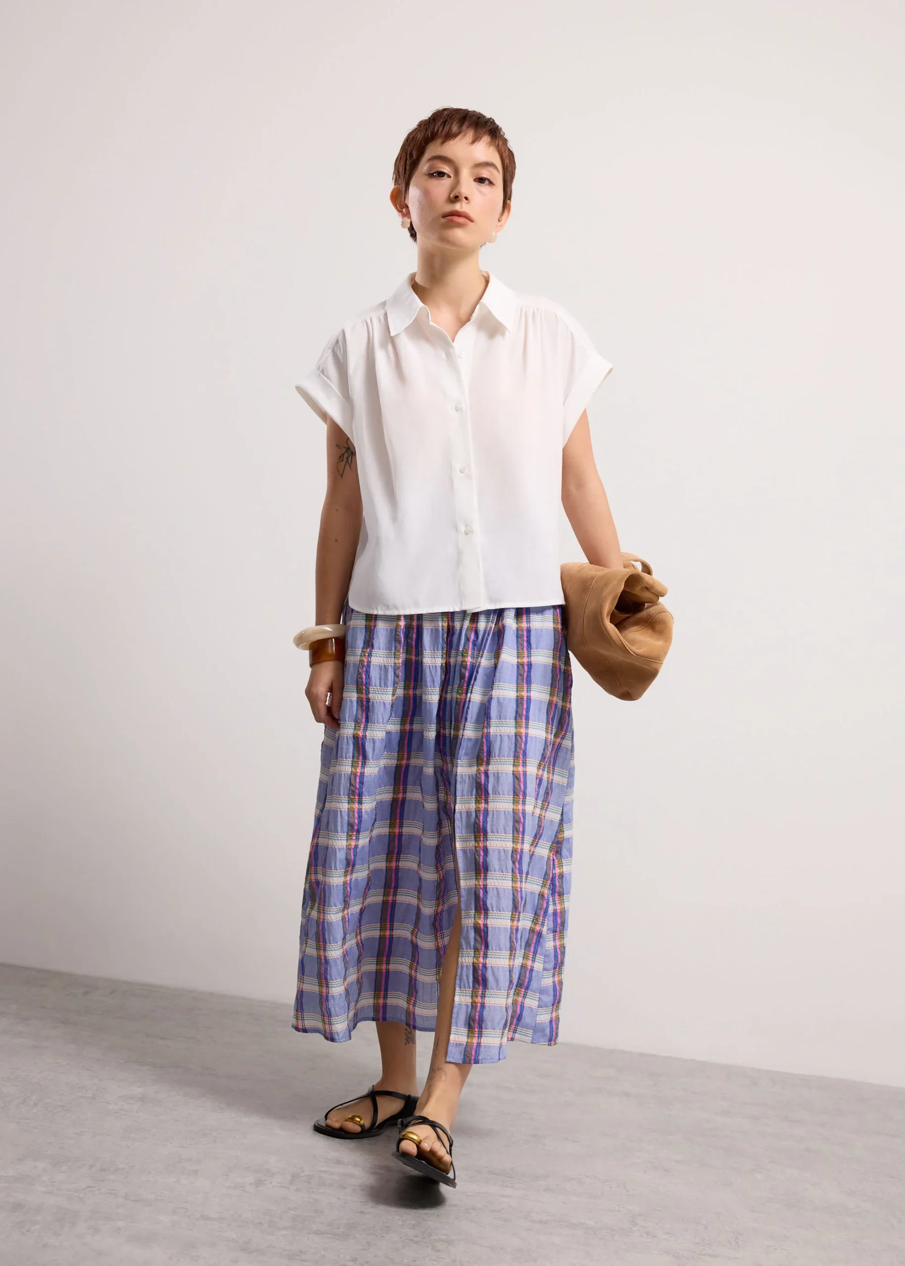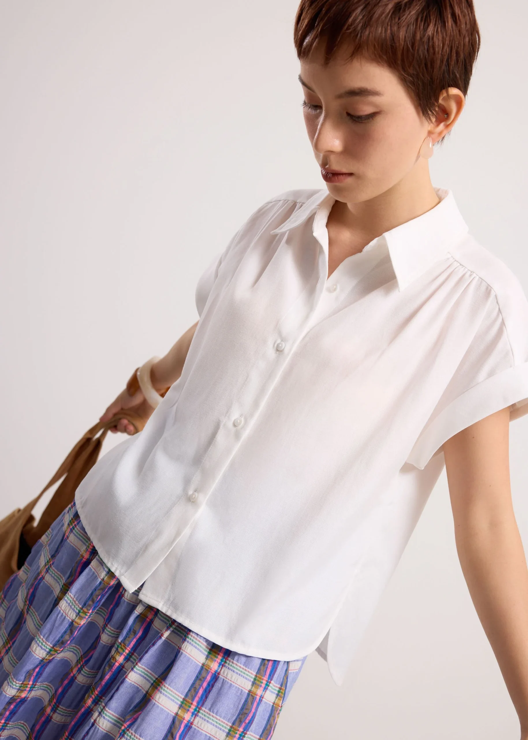 Experience effortless comfort and timeless style with this soft pink boxy shirt. Tailored with a relaxed fit, this shirt features a spread collar, short sleeves with turned-up hems, and a gently pleated back for extra ease of movement. The smooth, lightweight fabric drapes gracefully, making it perfect for all-day wear. A versatile piece that pairs well with trousers, skirts, or wide-leg bottoms for a polished yet laid-back look.