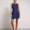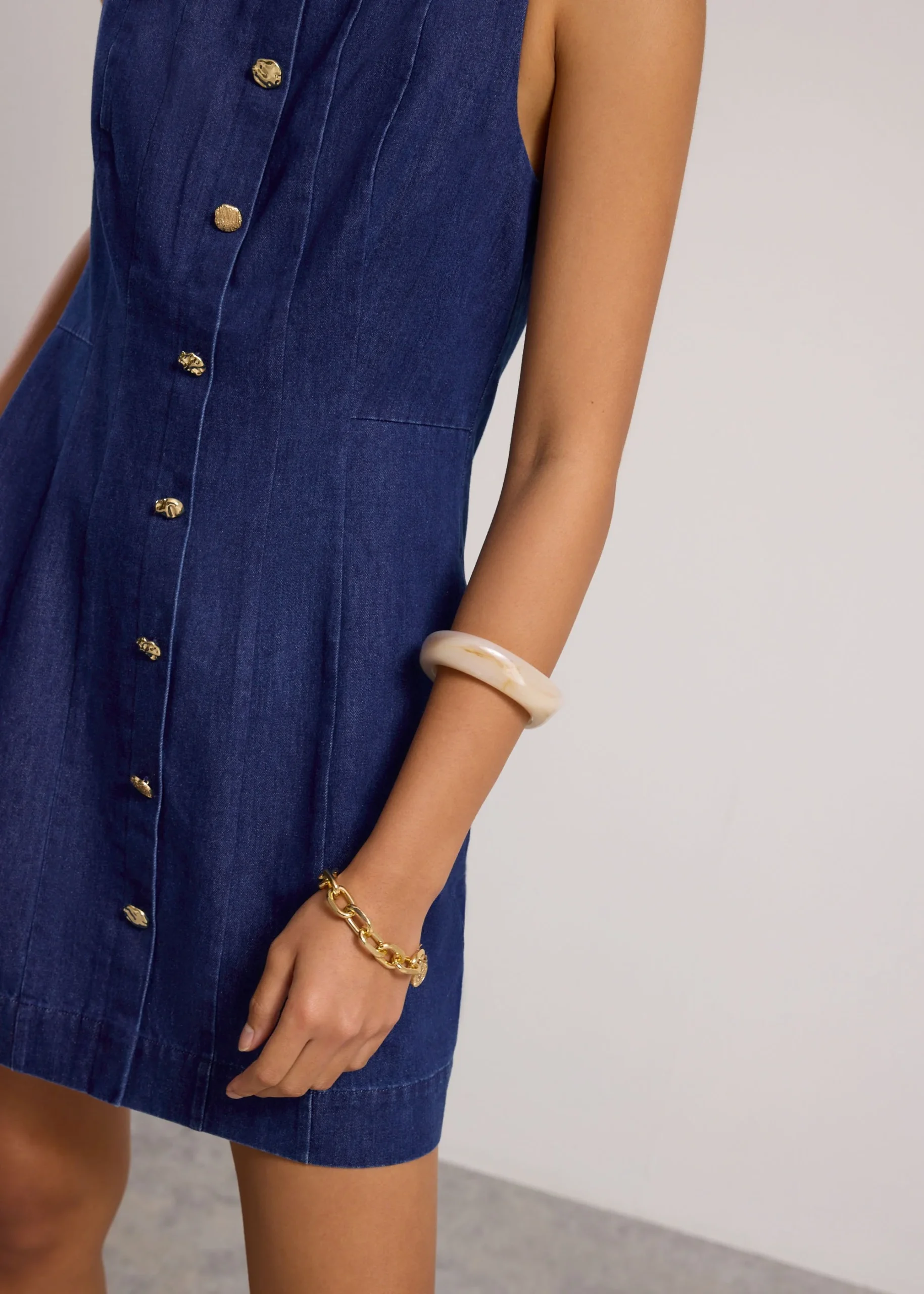 Showcase timeless style with this sleeveless indigo denim mini dress, perfect for casual afternoons and weekend outings. Crafted in soft, structured denim, the dress features a tailored A-line silhouette and an elegant square neckline. The front is adorned with a row of statement buttons, adding both charm and practicality. Easily pair this versatile dress with flats, sneakers, or sandals for an effortless look, and layer with a jacket on cooler days.