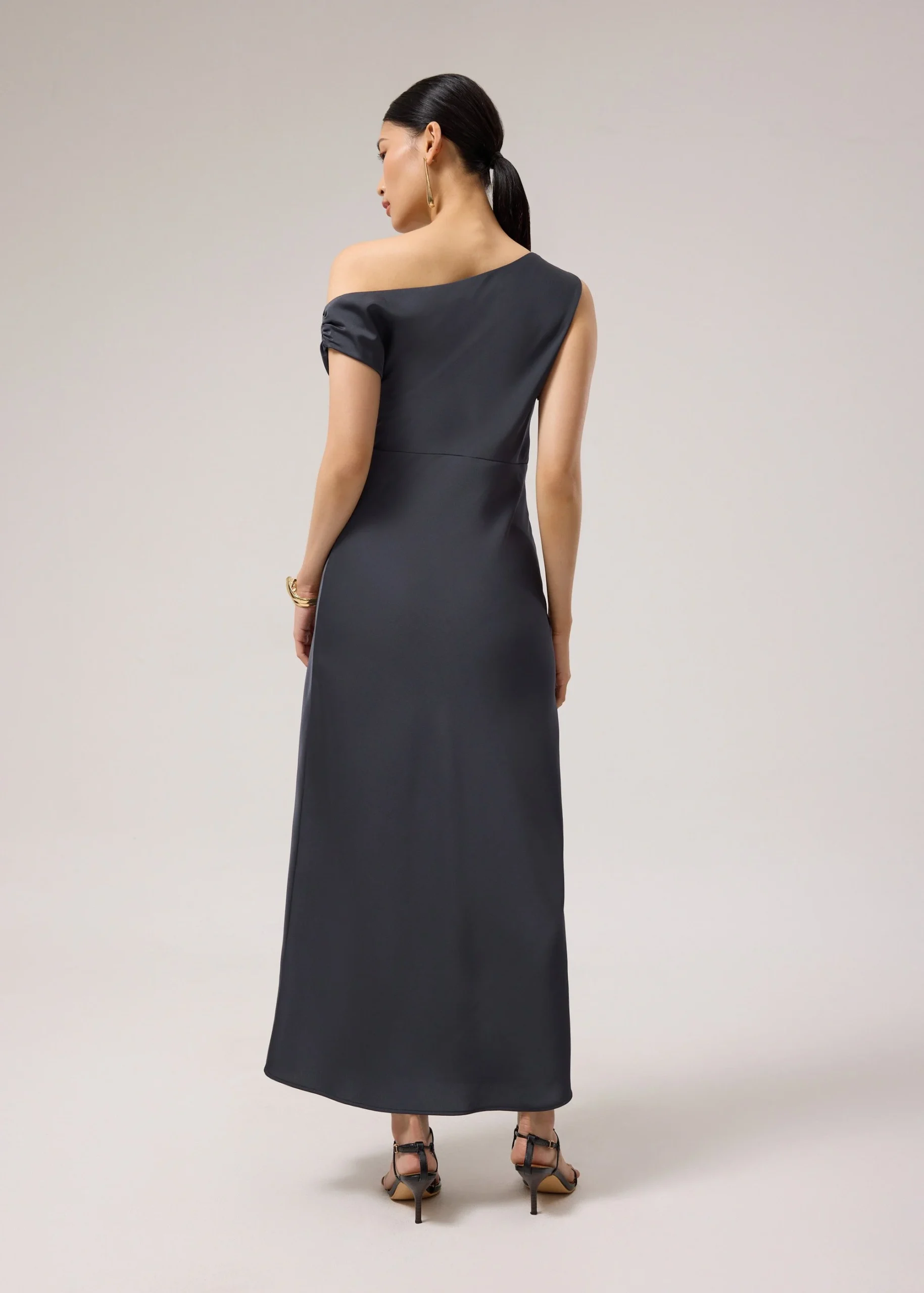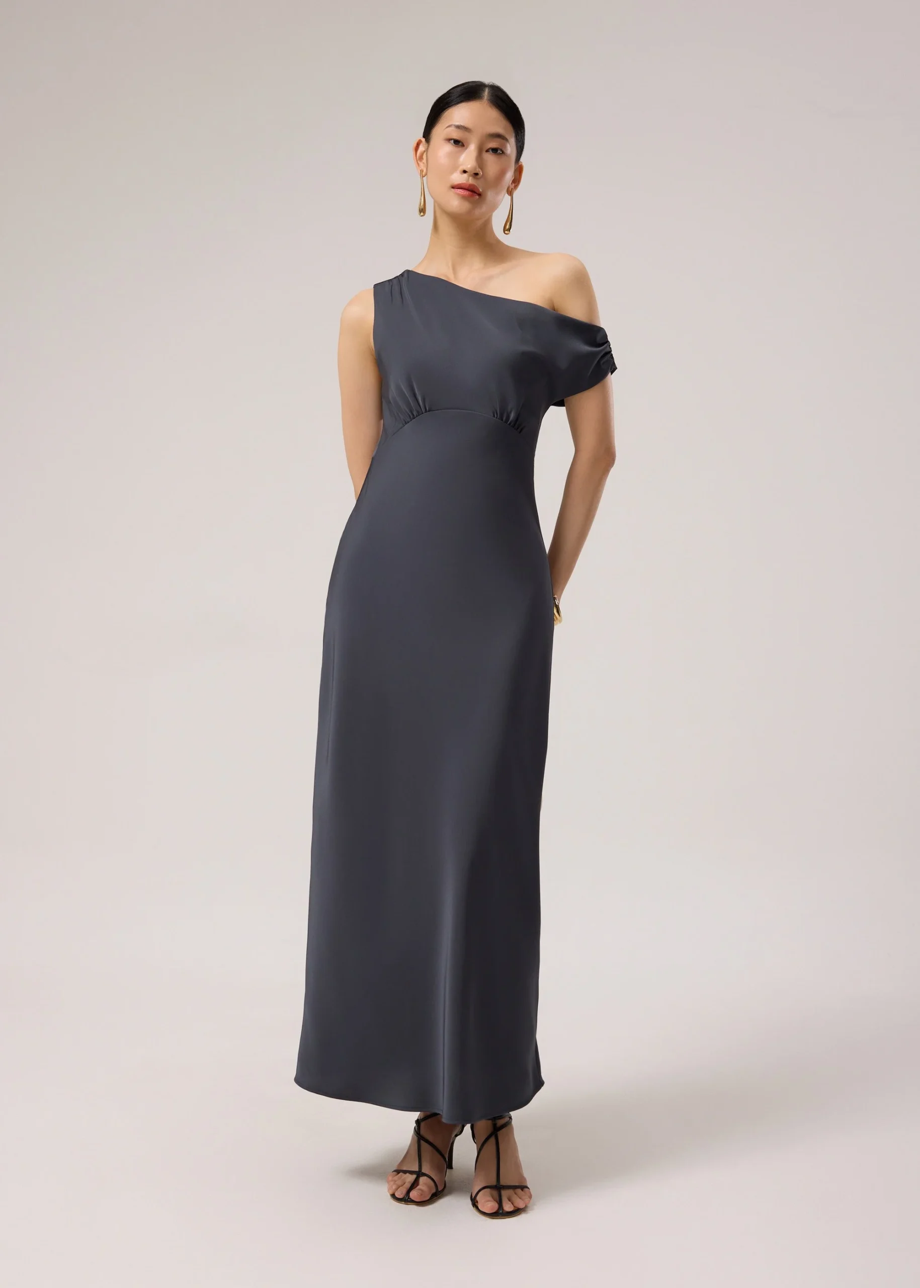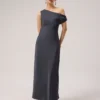 Channel understated chic with this minimalist one-shoulder gown in a sophisticated charcoal gray hue, tailored for a contoured yet comfortable fit that elegantly skims the body. The asymmetric neckline and single shoulder create a modern silhouette, while subtle gathers at the bust accentuate the waist for a refined finish. Crafted from soft, smooth fabric, this floor-length dress is ideal for evening parties, receptions, or formal occasions, offering a timeless appeal that pairs effortlessly with gold accessories and strappy heels.