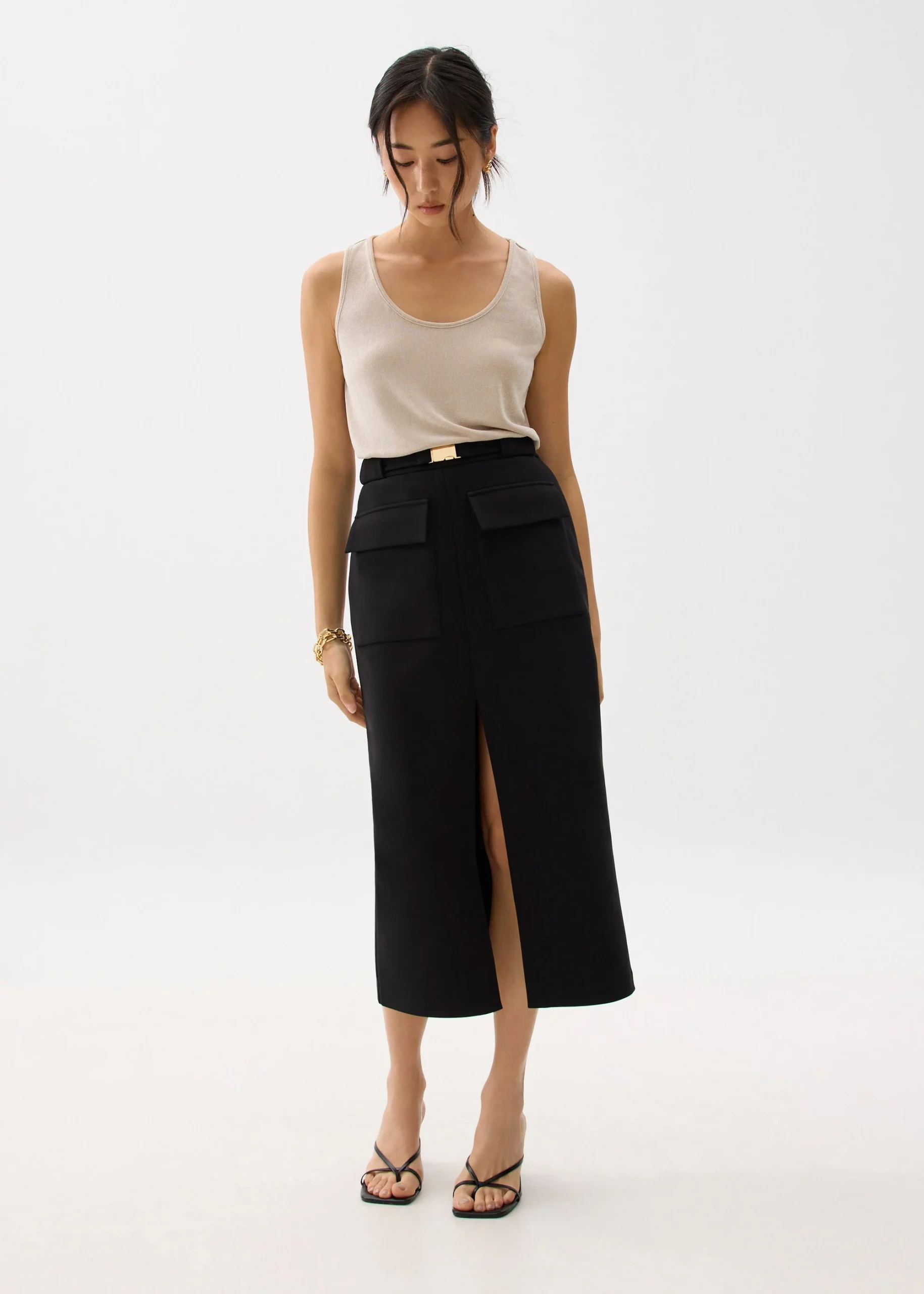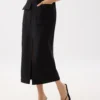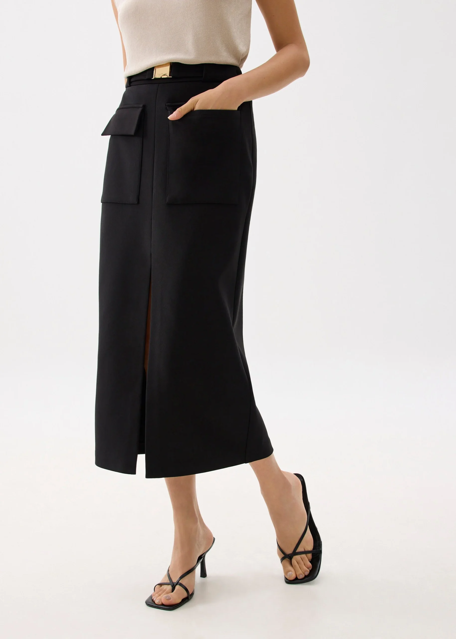 Experience modern sophistication with this chic black midi skirt, expertly designed for a flattering and versatile fit. The structured silhouette sits comfortably at the waist and flows into a streamlined pencil shape, making it suitable for both professional and social settings. Distinctive features include a prominent front center slit, two large utility pockets, and a sleek waistband accent with a gold-tone buckle. The premium fabric ensures durability and a polished look, while the minimalist design allows easy pairing with neutral tops and statement accessories.