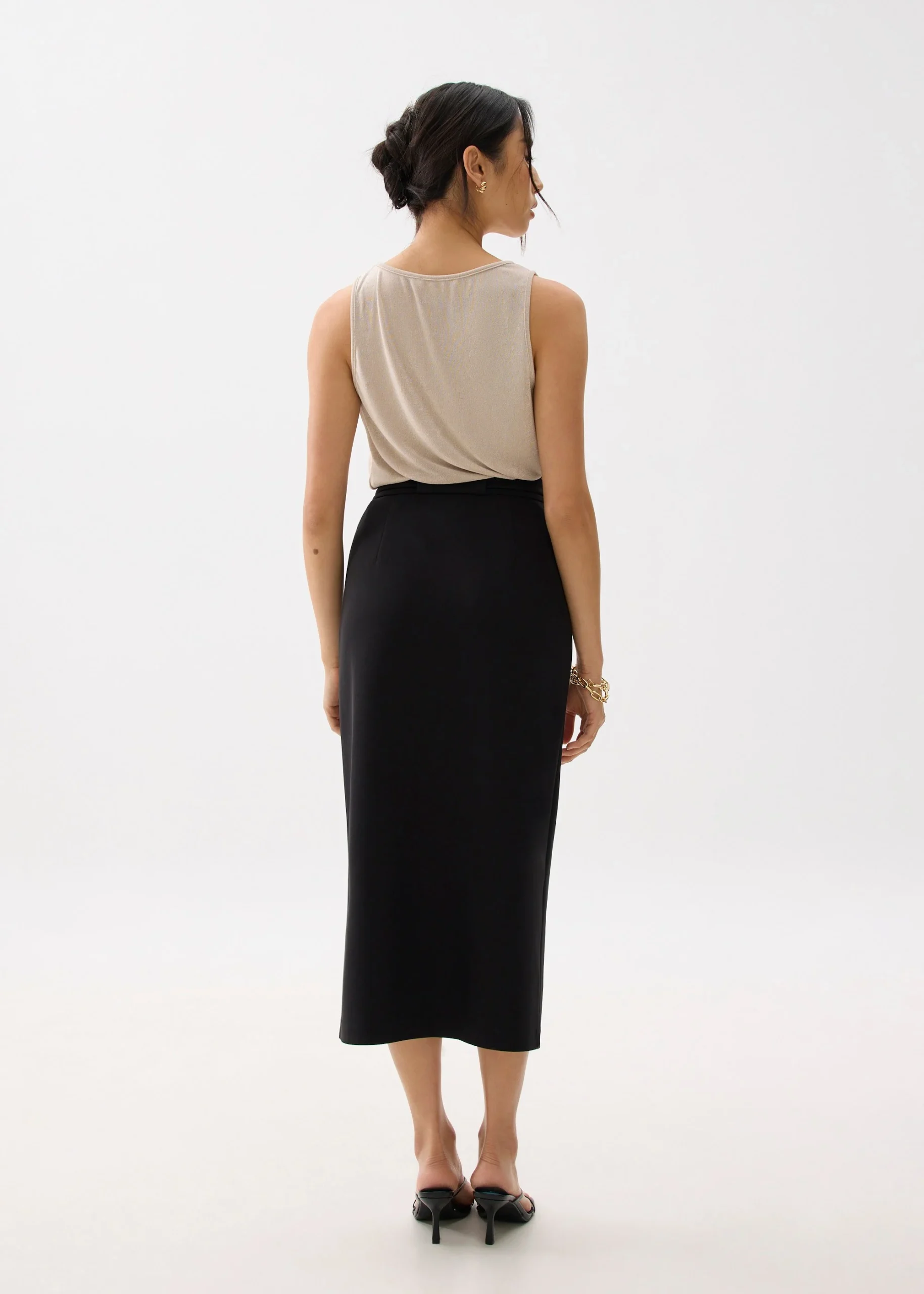 Style: High-waist, pencil midi skirt with front slit