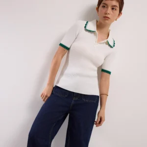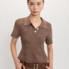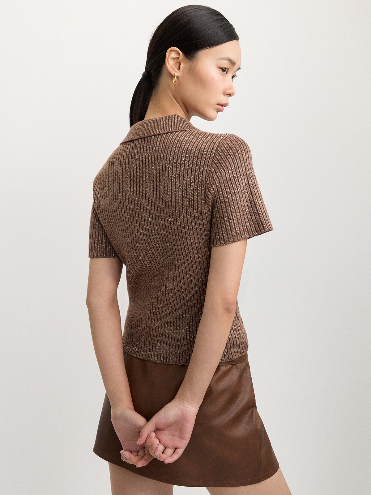Elevate your wardrobe with this sophisticated ribbed knit polo top in a warm cocoa brown. Featuring a flattering fitted silhouette, this top boasts short sleeves, a collared neckline, and a contemporary ribbed texture for modern appeal. Decorative crystal-embellished buttons add a touch of refined sparkle, making this piece ideal for both day and evening wear. Pair it seamlessly with skirts, trousers, or your favorite denim for effortless style.