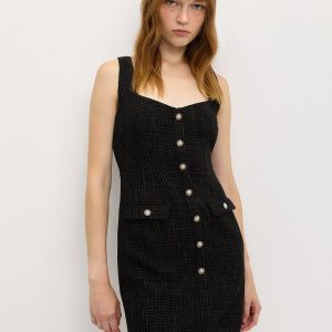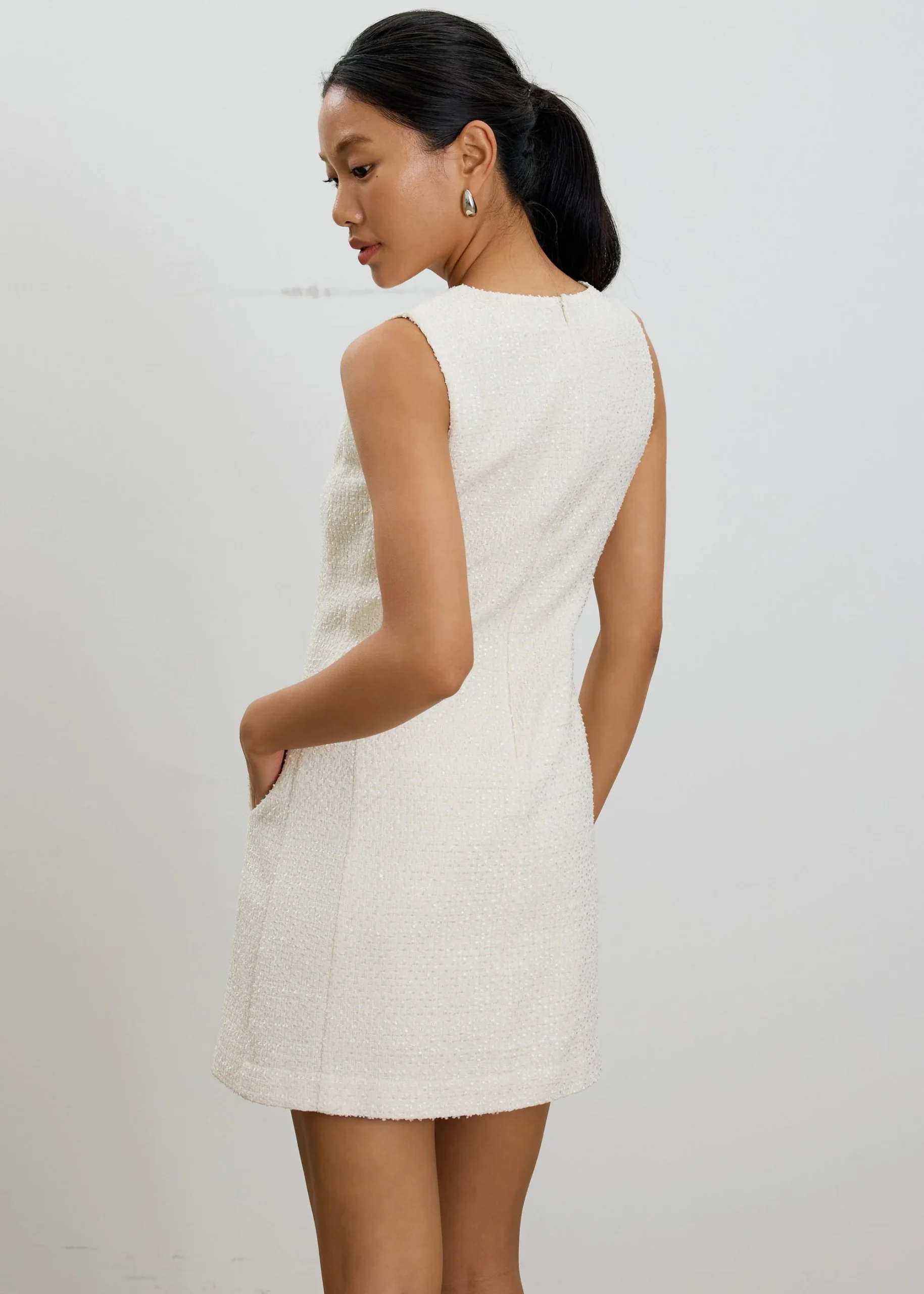 Bring timeless sophistication to any setting with this elegant ivory sleeveless mini dress. Crafted from a soft, textured fabric, this dress features a subtle sparkle woven throughout for a hint of glamour. The tailored silhouette is enhanced with a sleek V-notch neckline and darted seams that create a flattering fit. Thoughtful side pockets add a touch of practicality without sacrificing style. Finished with a minimalist back and a gently flared hem, this piece is perfect for elegant daytime events, evening gatherings, or smart-casual occasions.