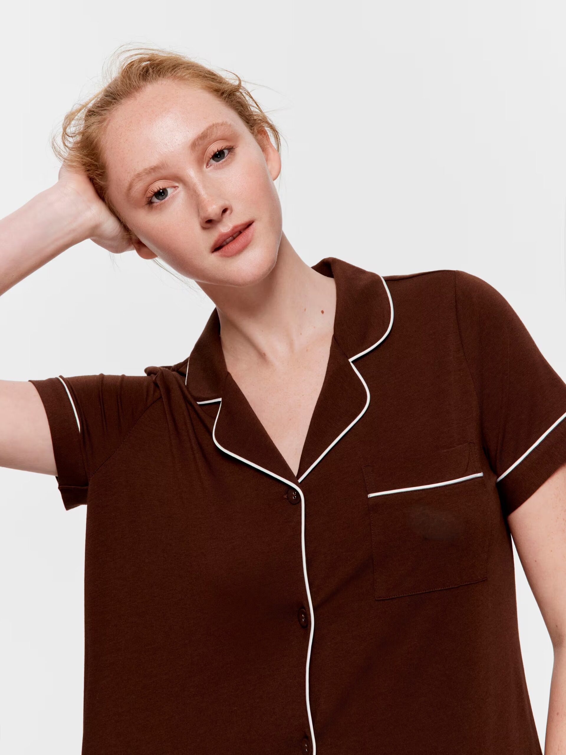 Bring a cozy, whimsical touch to bedtime with this chocolate brown sleep shirt, styled with classic contrast piping and a playful dachshund embroidery on the chest pocket. Its relaxed fit and notched collar create a timeless pajama look, while the button-down front and short sleeves offer easy comfort. Soft stretch fabric ensures a gentle feel against the skin, making it ideal for restful nights or relaxed lounging at home.