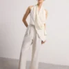 Embrace contemporary elegance with this cream sleeveless top, featuring a dramatic halter neckline and exquisite draped detailing across the front. The top is tailored for a fitted waist and flares subtly at the hem, creating a graceful silhouette. The open back with a high halter strap offers a sophisticated twist, perfect for formal occasions, evenings out, or chic summer gatherings. Crafted from soft, flowy fabric, this piece lends an airy feel while maintaining polished structure.