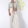 Refined and contemporary, these cream-colored wide-leg pants showcase subtle vertical pinstripes, perfectly blending timeless tailoring with a modern silhouette. The structured high-waisted fit and full-length wide legs create an elegant look that elongates the figure and offers effortless movement for the office or business meetings. Featuring a flat waistband, discreet belt loops, and welt back pockets, these pants present a polished profile suited for professional settings. The lightweight woven fabric ensures all-day comfort and a sophisticated finish whether styled with shirts, blouses, or smart jackets.