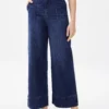 Elevate your style with these dark indigo wide-leg cuffed jeans, tailored for a sleek yet relaxed look. The high-rise silhouette and tailored front seams provide a flattering structure, while generous hems and prominent cuffs offer a fashion-forward update. The premium denim construction delivers a comfortable feel and enduring quality, making these jeans perfect for all-day wear. Easily pair them with both casual and polished tops for versatile styling throughout the week.