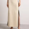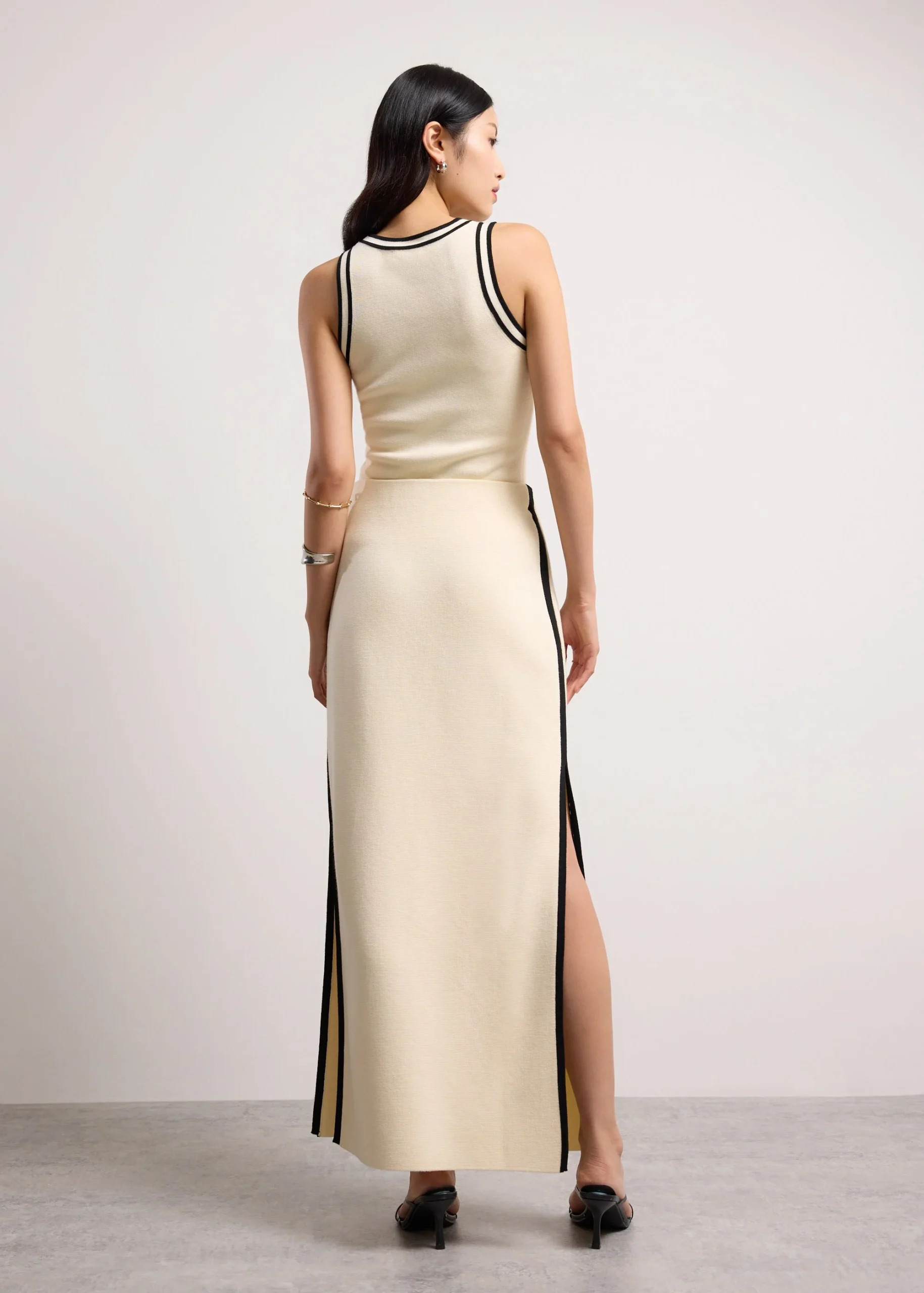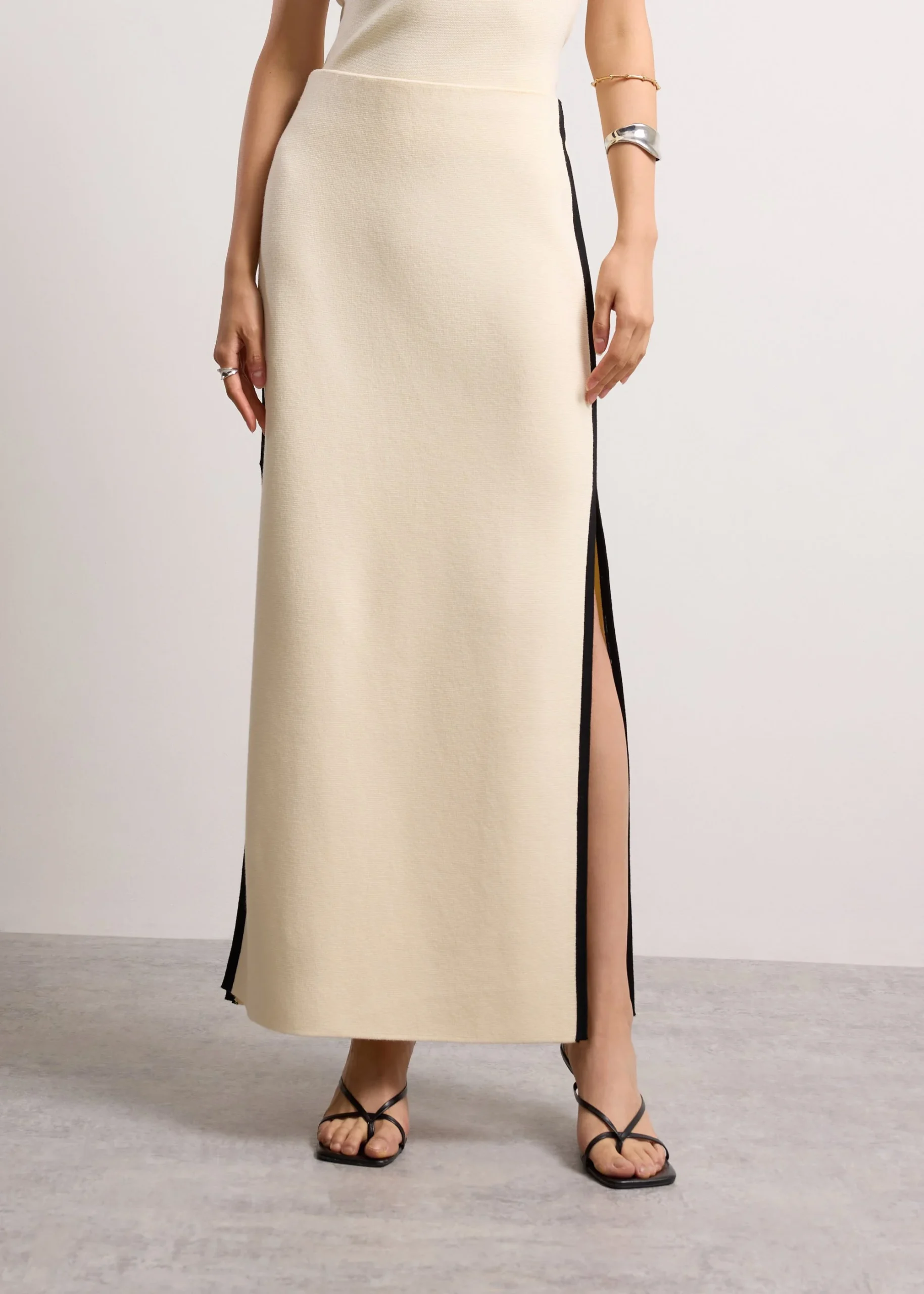 Step out in understated sophistication with this timeless cream knit maxi skirt, crafted from a soft, textured fabric that drapes gracefully for a flattering silhouette. The skirt features bold contrast black edging along the sides and hem, introducing a sleek, modern touch to the classic style. The straight-cut design is enhanced with side slits for ease of movement and subtle allure, while the high-waisted fit elongates your figure, making it perfect for both casual daytime looks and elevated evening outfits. Pair effortlessly with sleeveless tops, strappy sandals, or statement jewelry for a chic ensemble that transitions beautifully across seasons.