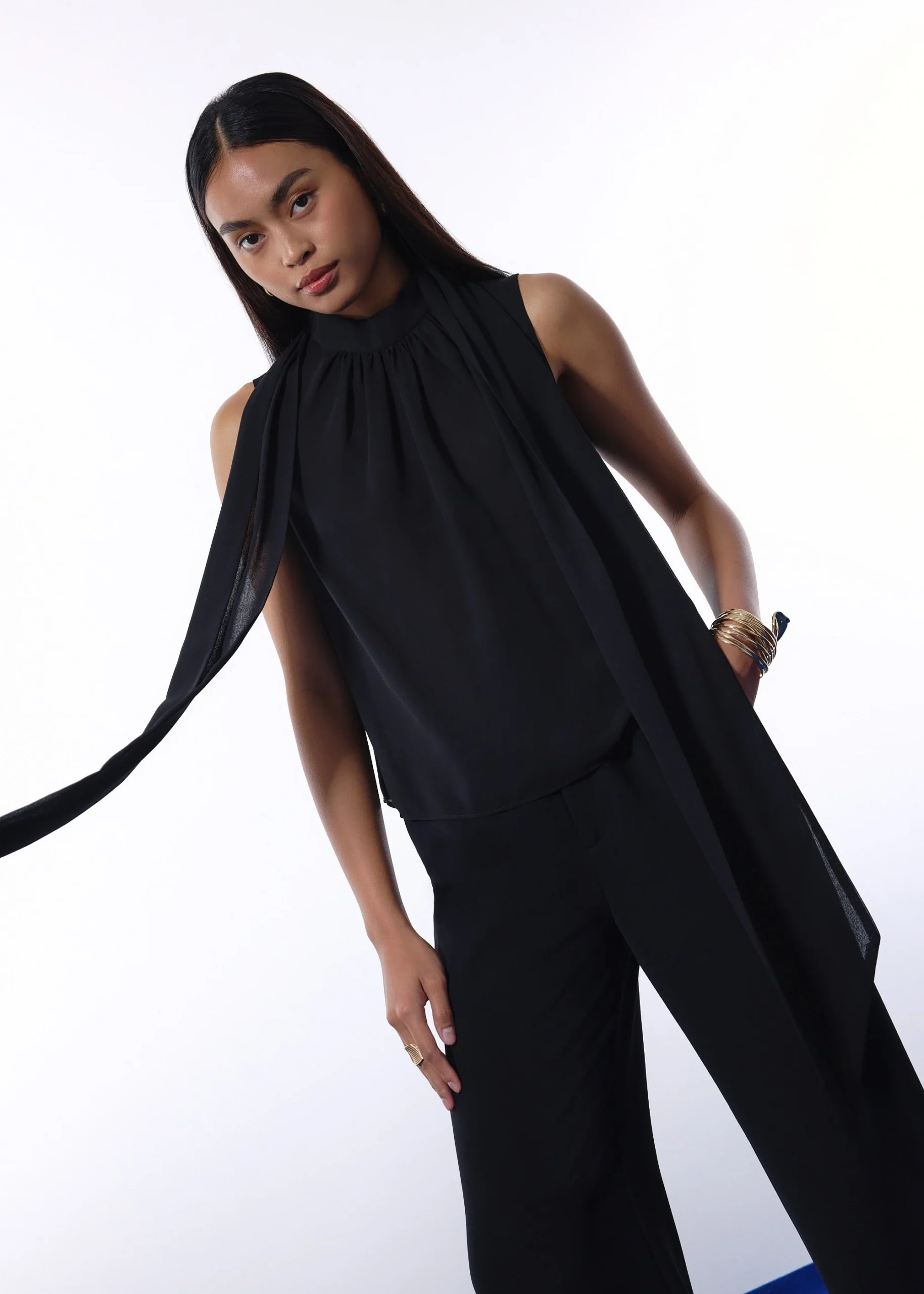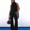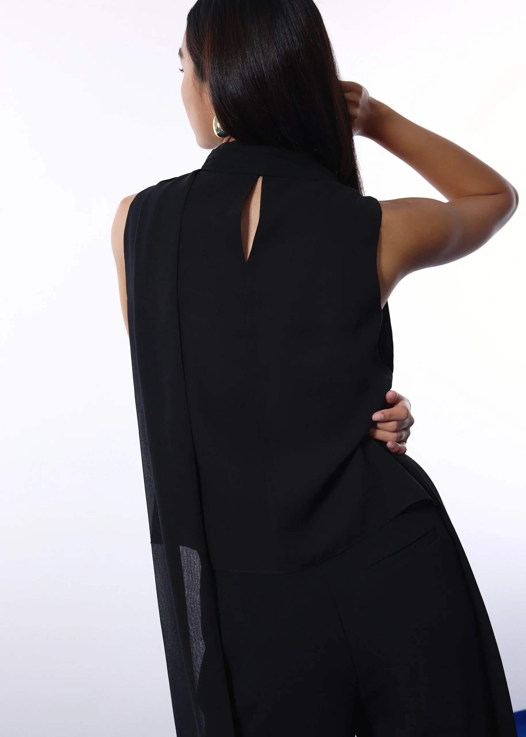 Elevate any wardrobe with this sophisticated sleeveless top, featuring a graceful draped back panel and a chic high neckline. Crafted in luxurious black fabric, the design blends tailored structure with a relaxed fit for a polished, modern silhouette. The standout feature is the dramatic semi-sheer, extended drape cascading from the neck to below the hem, creating a striking yet understated look from every angle.