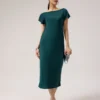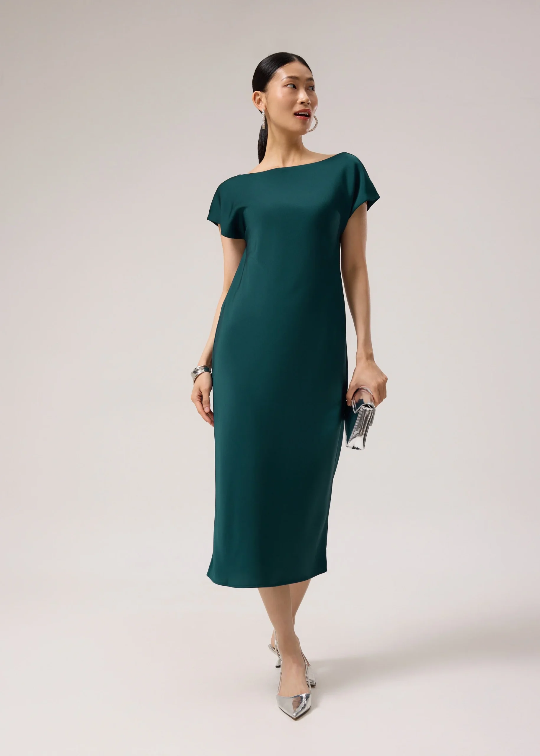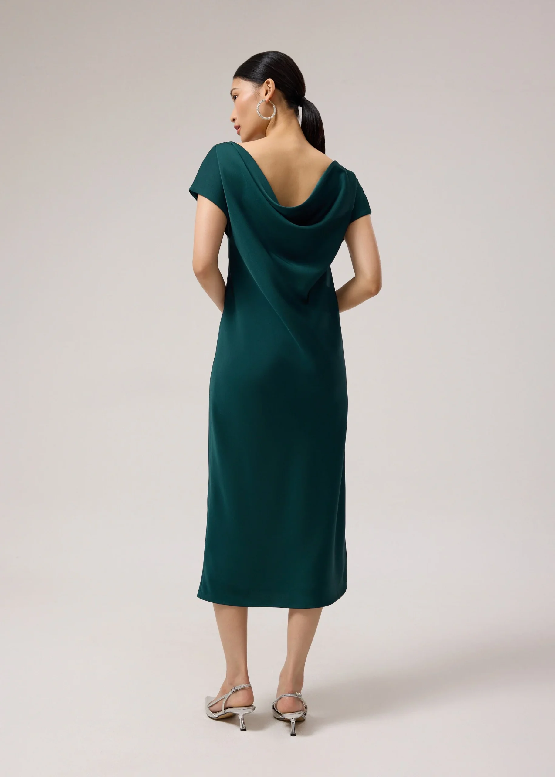 Step into timeless style with this sophisticated teal satin midi dress, designed to flatter with its graceful draped neckline and stunning low back. The smooth, fluid silhouette skims the figure, offering effortless charm for both special evenings and upscale gatherings. Featuring a softly cowl-necked front and an elegant cascade at the back, this dress combines classic allure with modern minimalism. Cap sleeves and a mid-calf length make it versatile—perfect for pairing with delicate heels and statement earrings for a polished look.