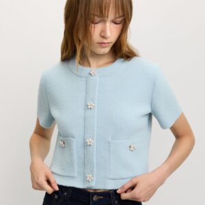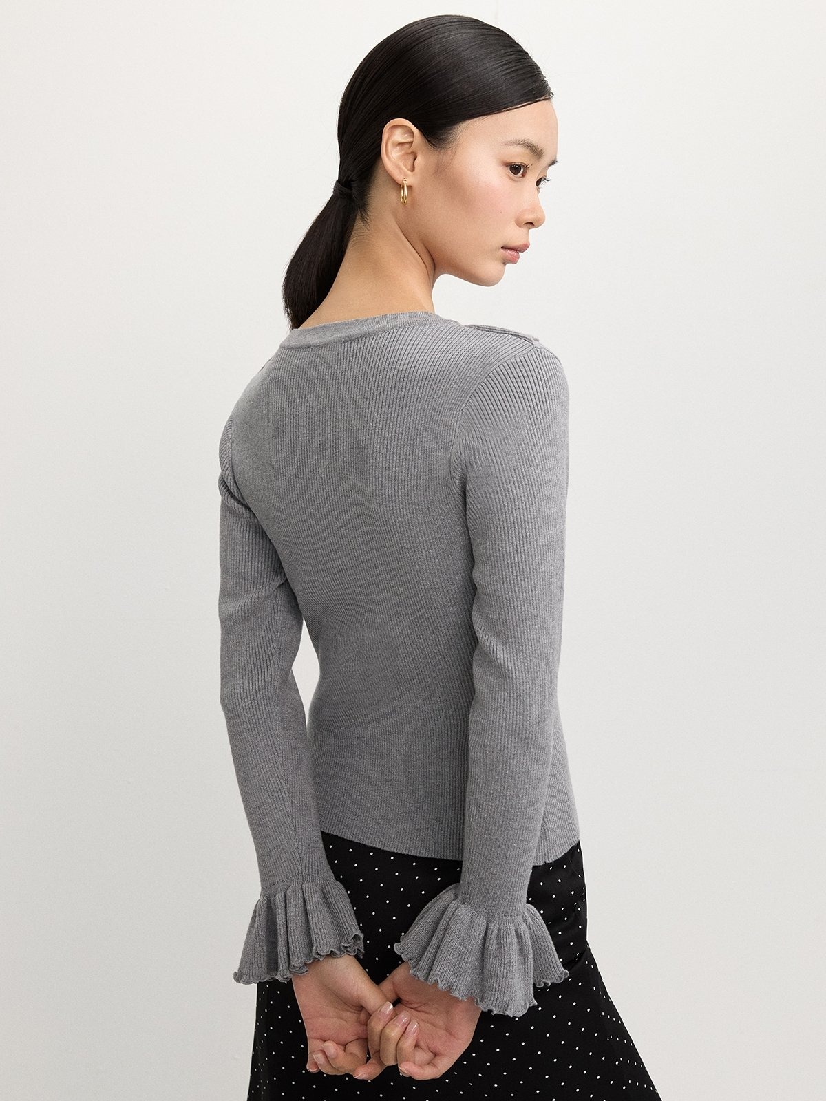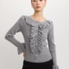 Elevate your knitwear with this elegant grey cardigan, defined by its romantic ruffle detailing along the front and neckline. Featuring a flattering, slim-fit silhouette, this design stands out with pearl-finish buttons and ruffled flounce cuffs for added flair. Crafted from a soft, medium-weight knit, this long-sleeve cardigan delivers both comfort and statement style, easily transitioning from day to evening.