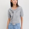 Step out in modern style with this heather grey knit top, featuring a unique built-in scarf detail that drapes elegantly across the neckline. The short sleeves and thick hem ribbing give a tailored feel, while the soft knit fabric provides all-day comfort. An open back scoop design with a minimalist strap and decorative metallic accent adds an unexpectedly chic touch, making this top perfect for work or a casual day out.