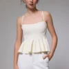 Add effortless elegance to any outfit with this ivory ribbed knit peplum top. Featuring a fitted bodice with a soft ribbed texture, this top is highlighted by its playful pleated hem that creates a flattering, feminine silhouette. The adjustable shoulder straps offer a customized fit, and the squared neckline delivers a modern, polished touch. Made from comfortable stretch fabric, this top transitions seamlessly from daytime looks to chic evenings out. Pair with tailored trousers or skirts for refined style appeal.