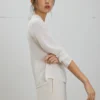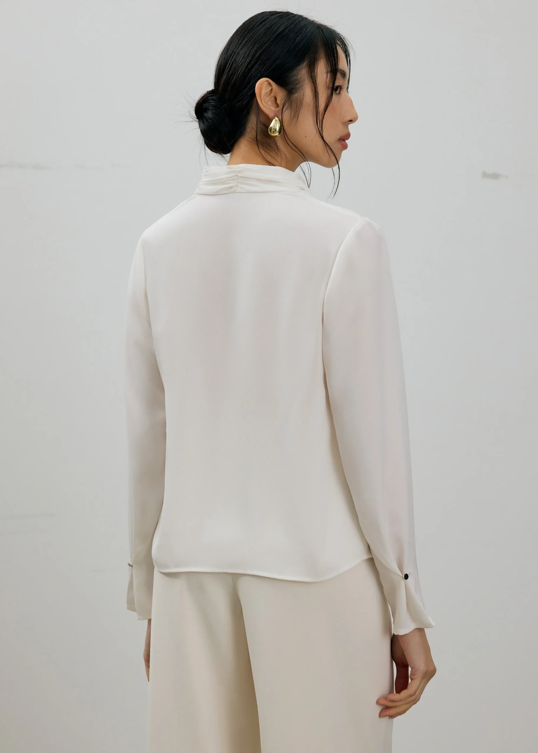 Elevate your wardrobe with this minimalist white drape front blouse, designed for a look of effortless refinement and sophistication. Featuring a gently draped V-neck leading to a subtle twist at the hem, this blouse flatters the figure while offering comfortable ease. Crafted from a smooth, lightweight fabric, the top exudes elegance whether styled for professional settings or elegant evenings out. The long sleeves and sleek button cuffs complete the timeless look, making it a versatile must-have for every modern wardrobe.