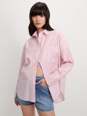 Bring a breath of fresh air to professional and casual wardrobes with this mint green striped button-down shirt. Designed with a relaxed fit, classic collar, and dropped shoulder seams, the shirt features vertical green pinstripes on a light base, enhancing its sleek appeal. Crafted from lightweight woven fabric, the piece offers comfort and effortless style, making it perfect for layering over tanks or pairing with tailored trousers for a smart-chic look.