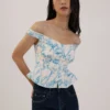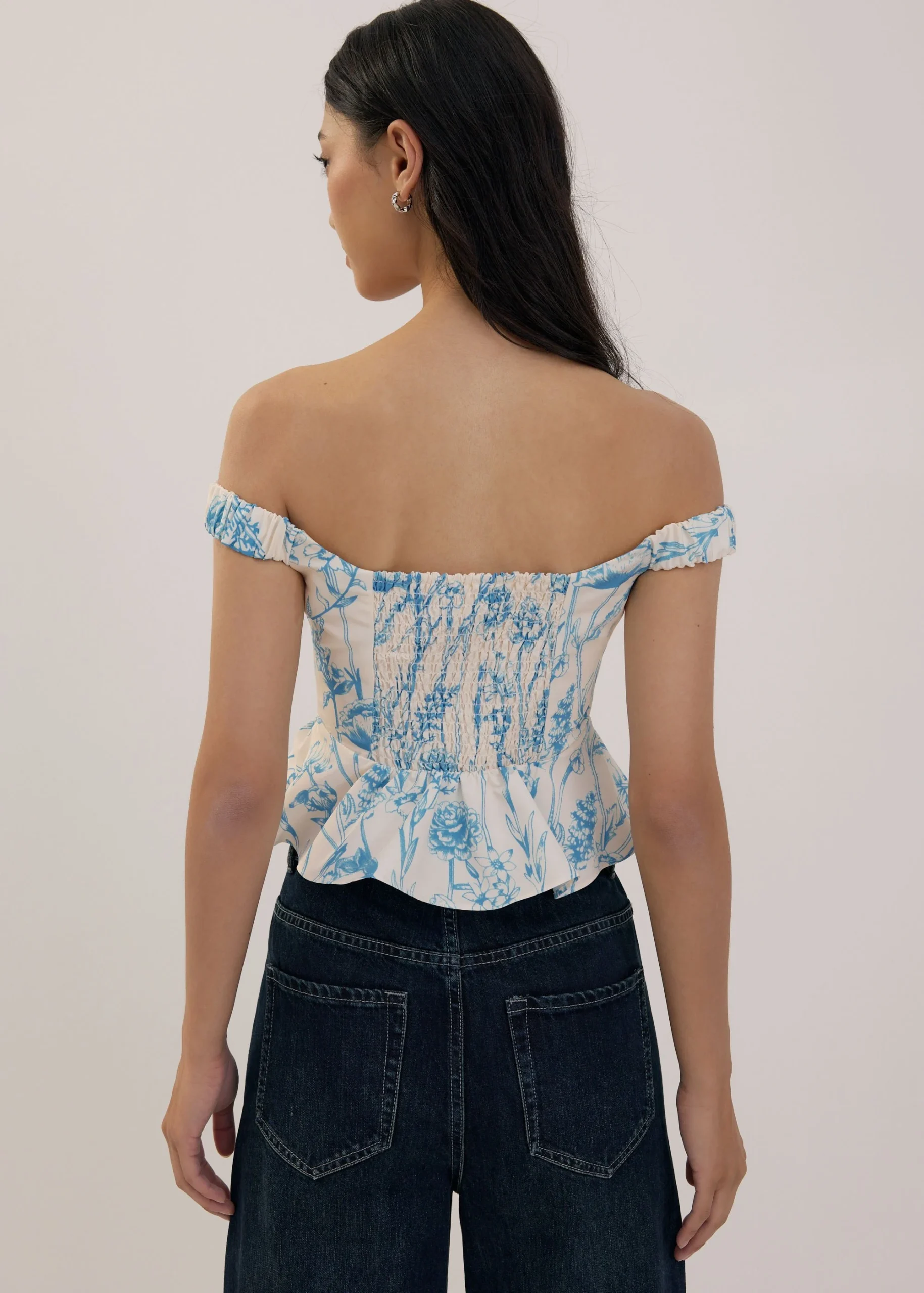 Step into timeless elegance with this off-shoulder peplum top featuring a charm of delicate blue floral prints against a soft white backdrop. The off-shoulder neckline enhances the collarbones while elastic gathers at the shoulders and back ensure a secure fit. The structured bodice flows into a gentle peplum hem, flattering the waistline for a feminine silhouette. Crafted from smooth woven fabric, this piece pairs effortlessly with denim, skirts, or tailored pants for day-to-evening style versatility.