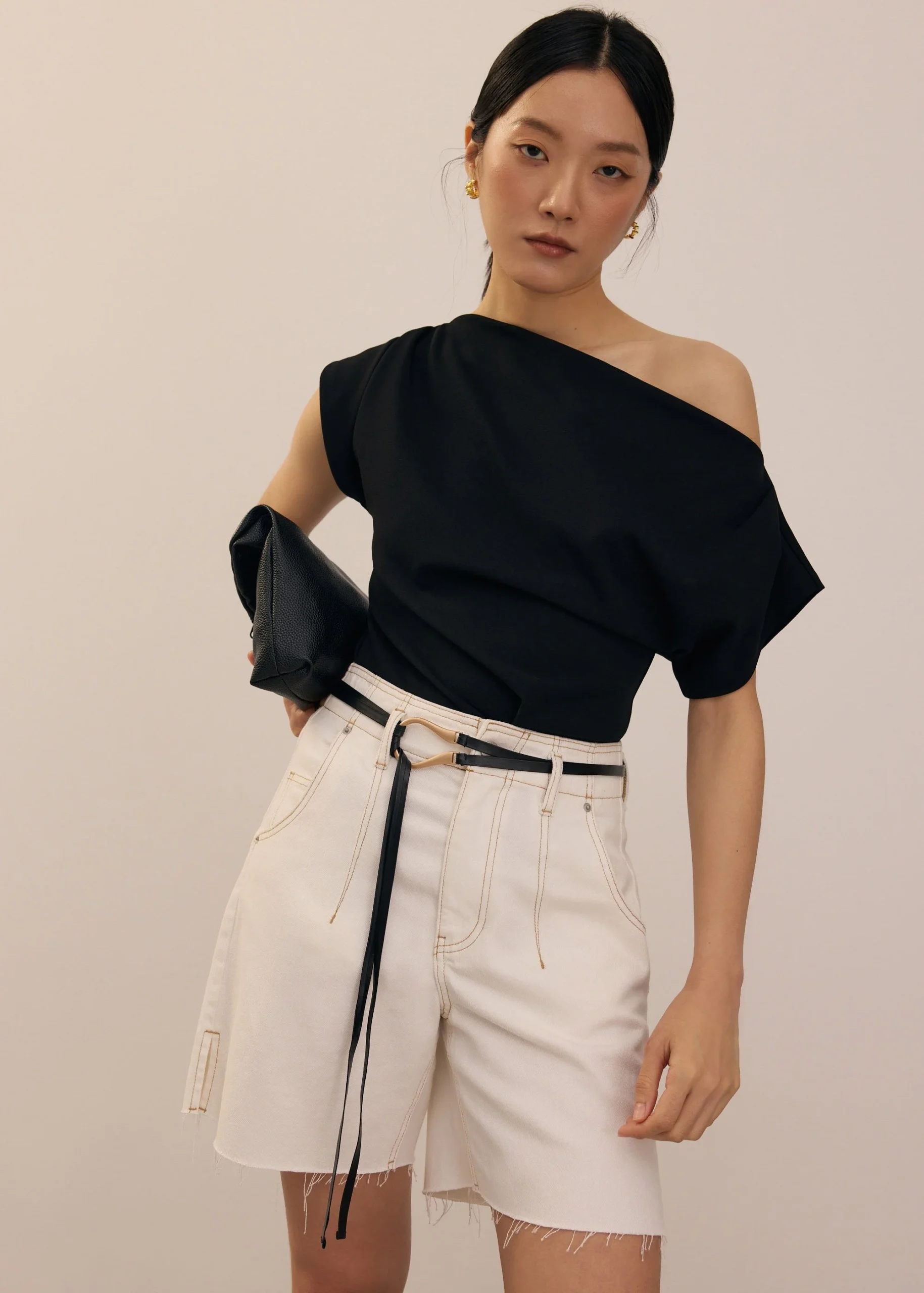 Step up your summer style with these off-white high-waist denim shorts featuring a modern raw hem finish. Crafted from sturdy cotton denim, these shorts offer a classic five-pocket silhouette with a relaxed fit and subtle brown contrast stitching. The mid-thigh length and unfinished hemline create a casual, contemporary edge, while the included slim black belt adds a touch of definition and versatility. Perfect for pairing with statement tops, these shorts bring effortless chic to day-to-night looks.
