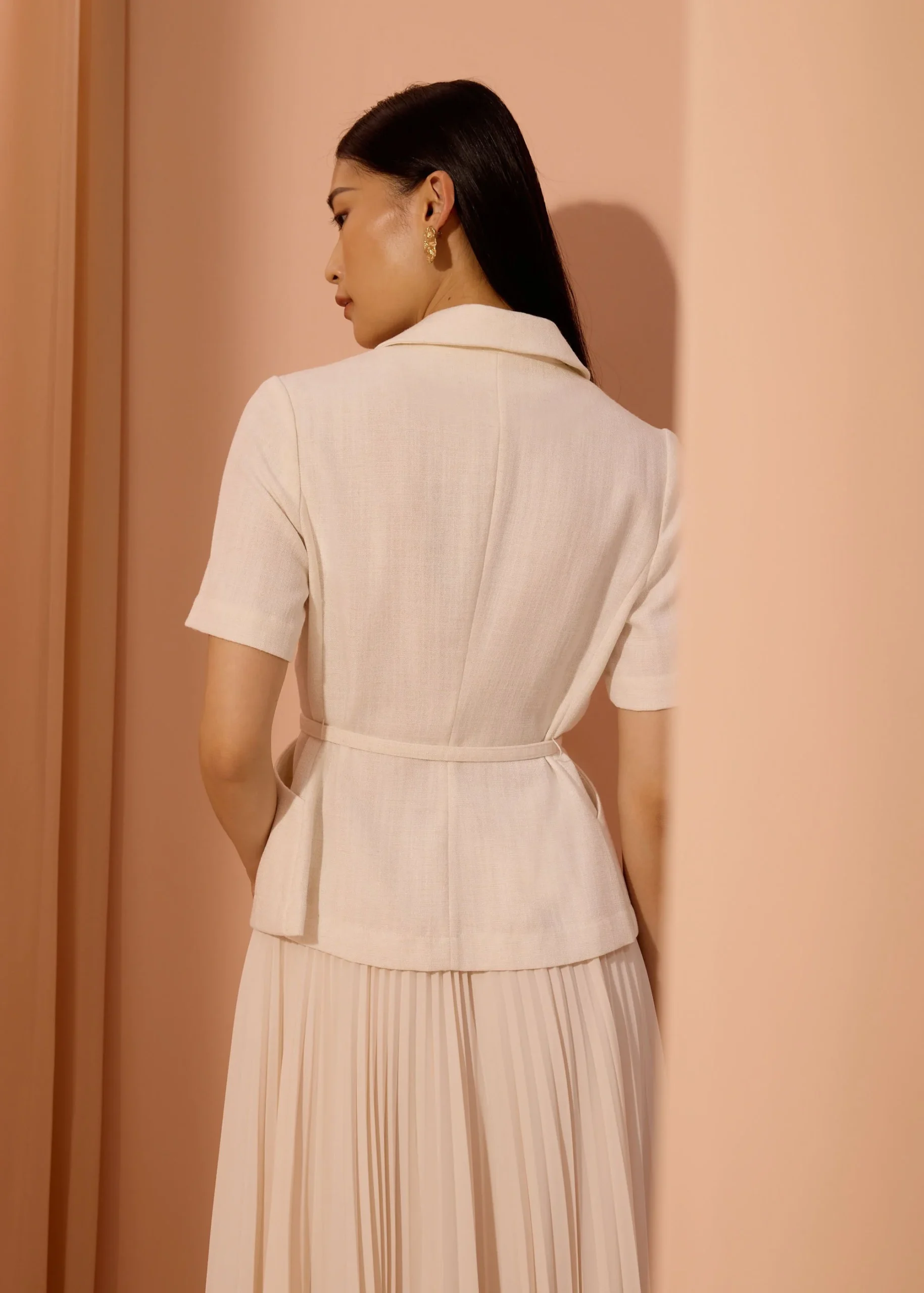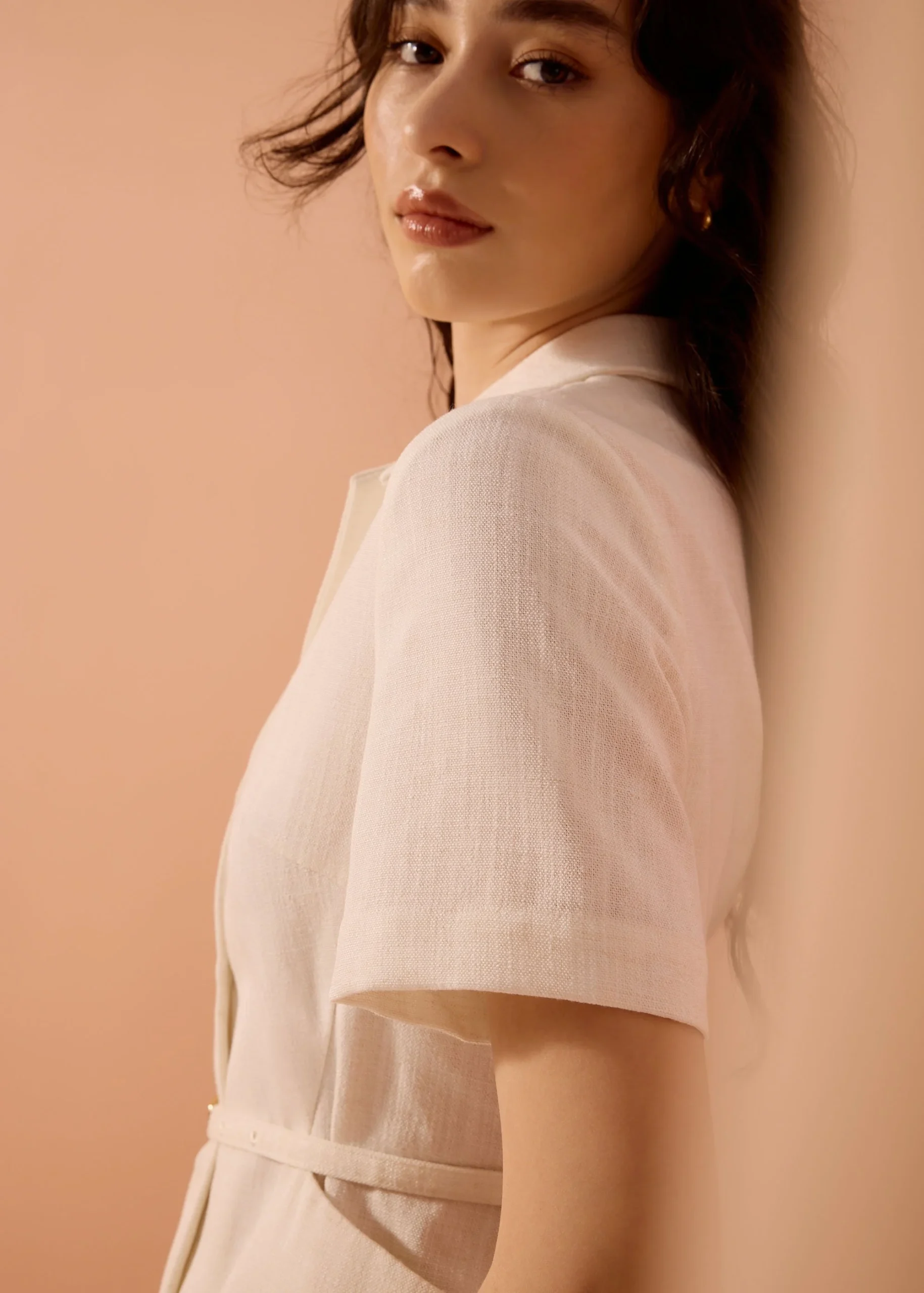 Refine your style with this elegant ivory button-down shirt, crafted in a lightly textured woven fabric for a soft, sophisticated finish. The tailored silhouette is enhanced by a matching belted waist, adding subtle structure and definition. Featuring a collared neckline, short sleeves, and a clean button placket, this top transitions effortlessly from meetings to leisure outings. Pair it with pleated skirts or tailored trousers for timeless polish.