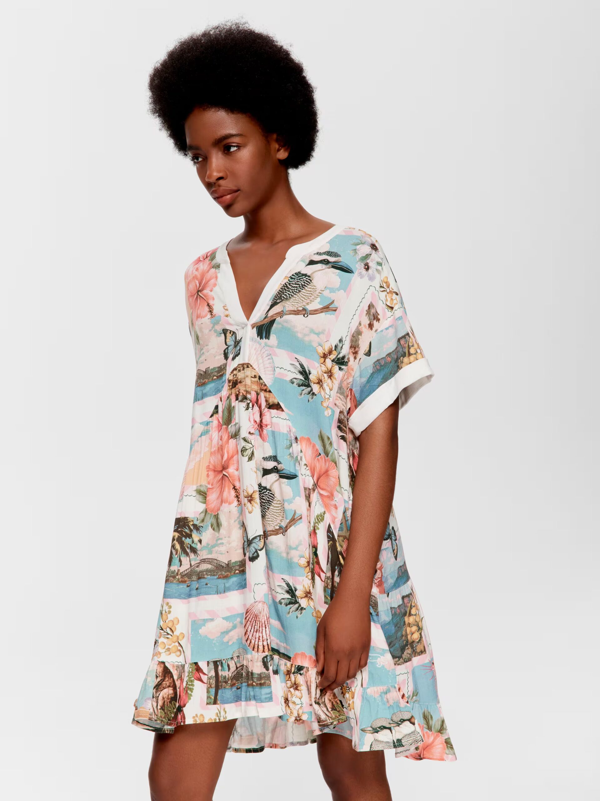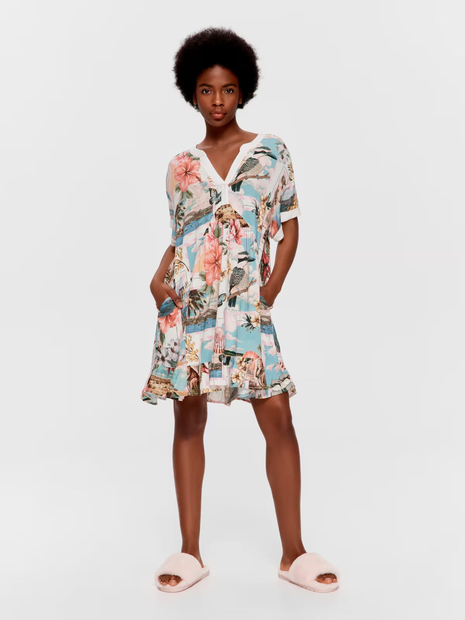 Step into paradise with this breezy kaftan dress, designed with an all-over tropical postcard motif bursting with vibrant florals, exotic birds, butterflies, and scenic landscapes. The relaxed silhouette features a V-notch neckline, short dolman sleeves, and practical side pockets, making it ideal for effortless lounging or vacation strolls. Finished with a soft flounce at the hem, this lightweight dress offers comfort and playful movement, transporting everyday style to a sun-soaked escape.