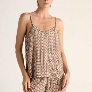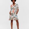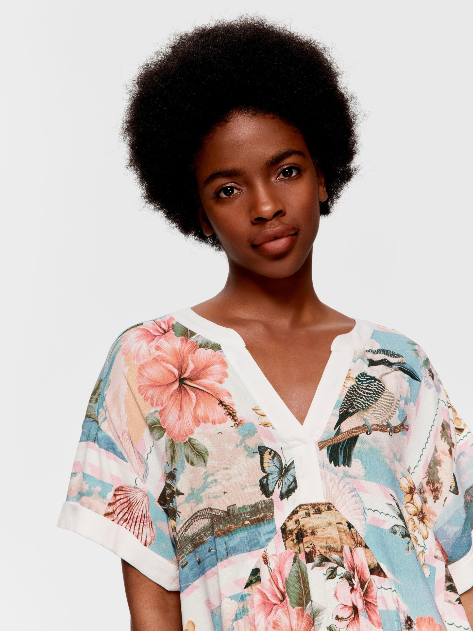 • Pattern: Multicolor postcard-inspired print with birds, shells, and tropical flowers