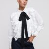 Make a statement in your formal wardrobe with this exquisite white lace blouse, designed for modern sophistication with vintage-inspired allure. Featuring dramatic lace ruffle details and a mesh overlay, this blouse elevates classic shirt styling. The sharp pointed collar and long sleeves offer structure, while the bold contrast black bow-tie adds a touch of refinement. Perfect for special occasions, office parties, or any event where you want to stand out.