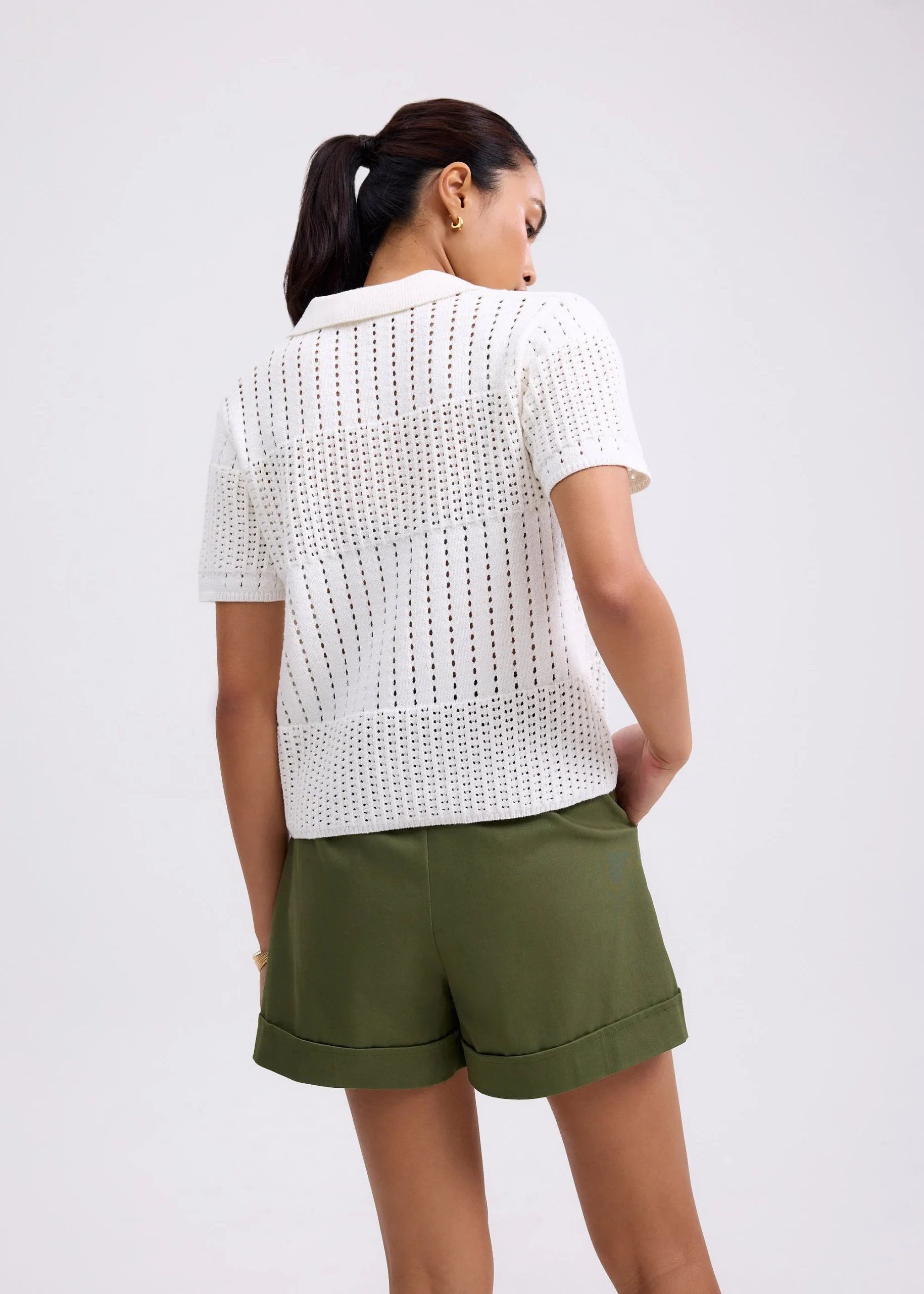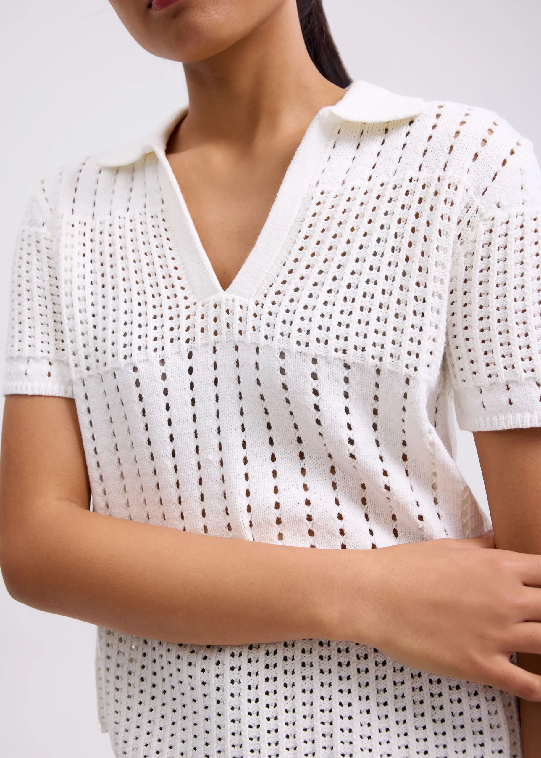 Embrace airy sophistication with this white open-knit short sleeve top, designed with a soft collar and flattering V-neckline. The lightweight knit features vertical and horizontal eyelet stripes, offering a breezy charm perfect for warm-weather style. Semi-sheer and versatile, this top pairs beautifully with high-waisted shorts, jeans, or skirts for a fresh daytime ensemble. Ideal for creating layered looks or for standalone elegance.